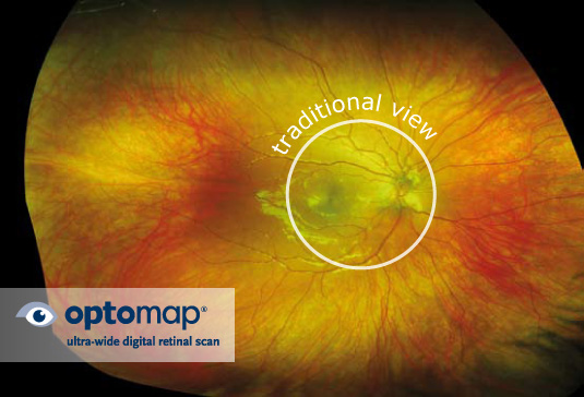 Optos’ patented ultra-widefield digital laser scanning technology acquires images that support the detection, diagnosis, analysis, documentation, and management of ocular pathology and systemic disease that may first present in the periphery of the retina (back of eye). These conditions may otherwise go undetected using traditional examination techniques and equipment. Simultaneous, non-contact, central pole-to-periphery views of up to 82% or 200 degrees of the retina (back of eye) are displayed in one single capture, compared to 45 degrees achieved with conventional methods.
